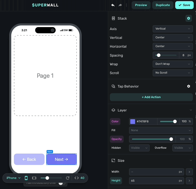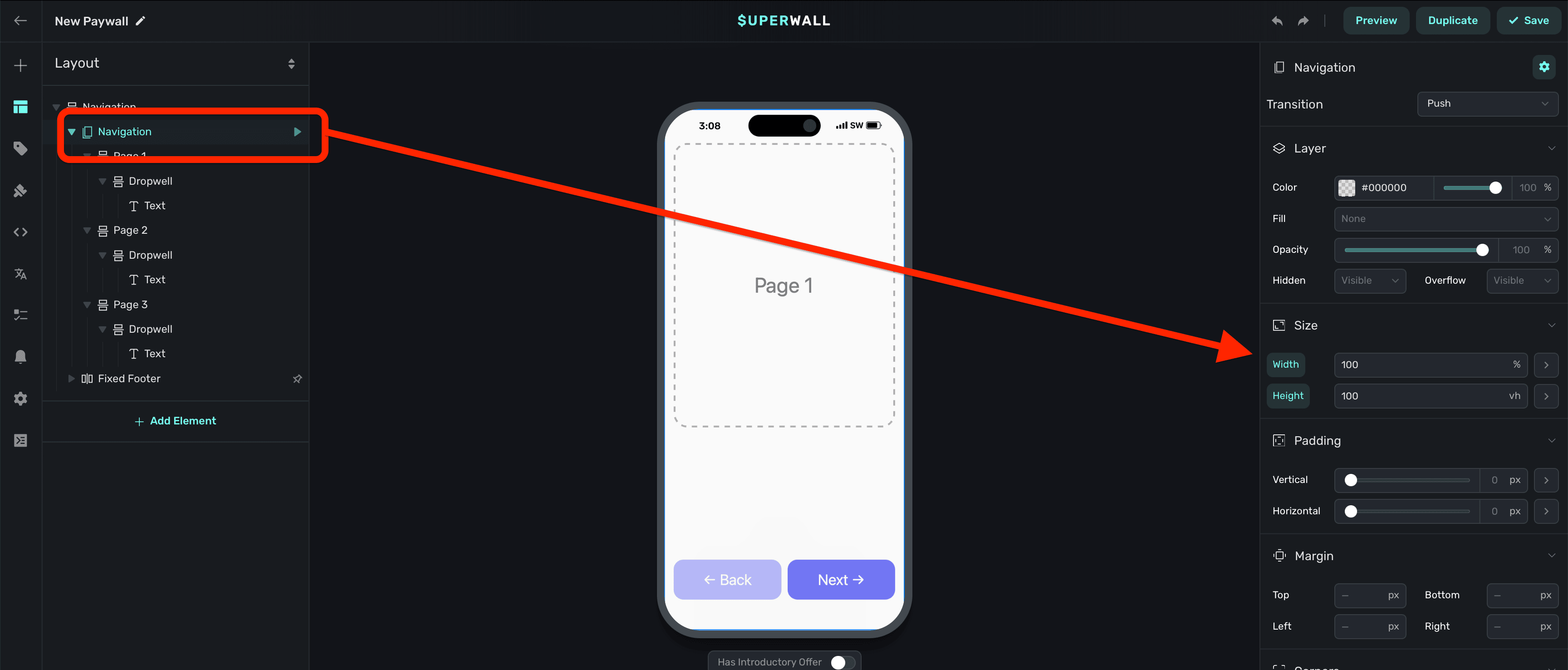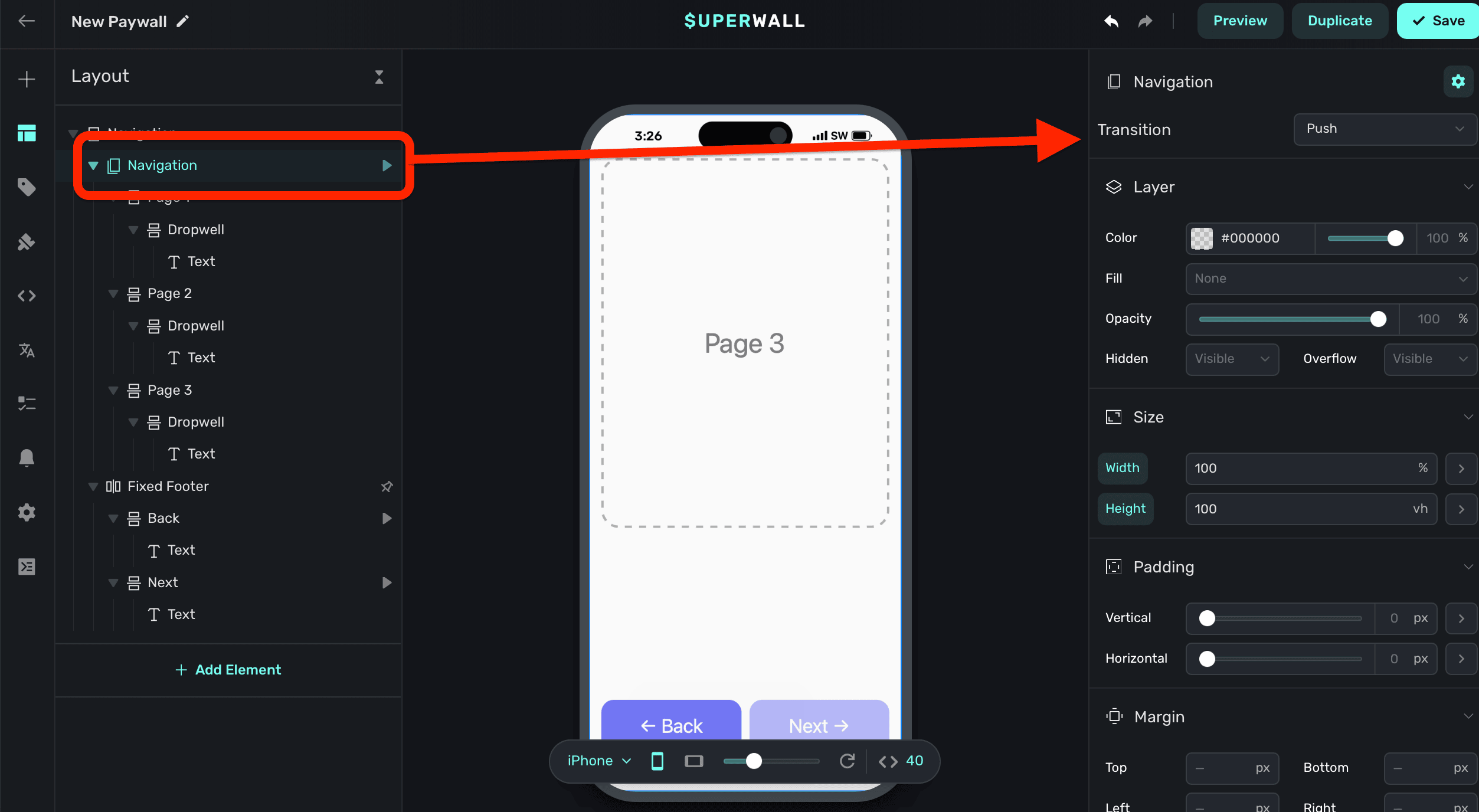 Use Superwall's navigation component to navigate through pages of content.