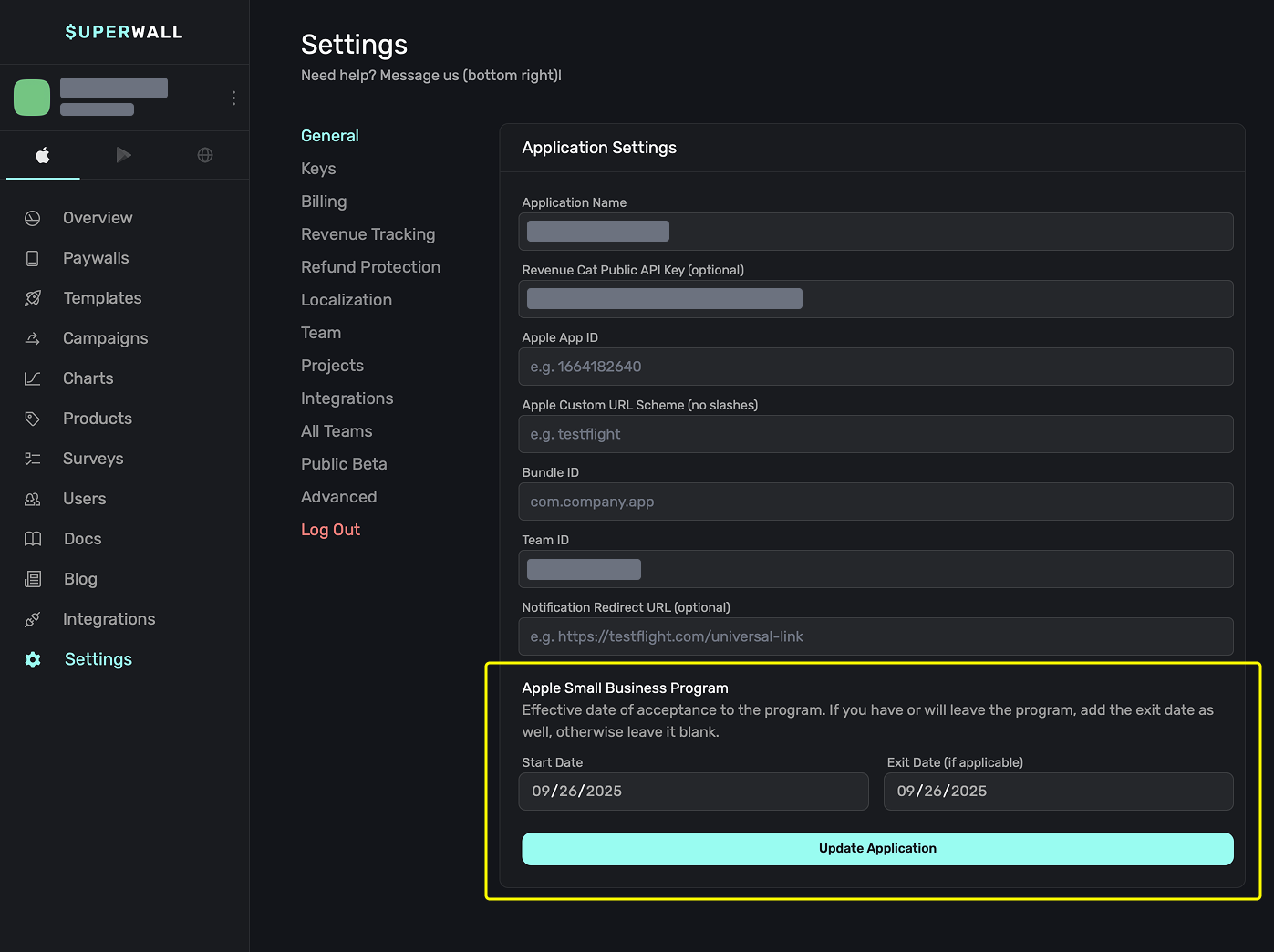 To update your Apple Small Business Program status in Superwall: